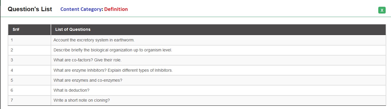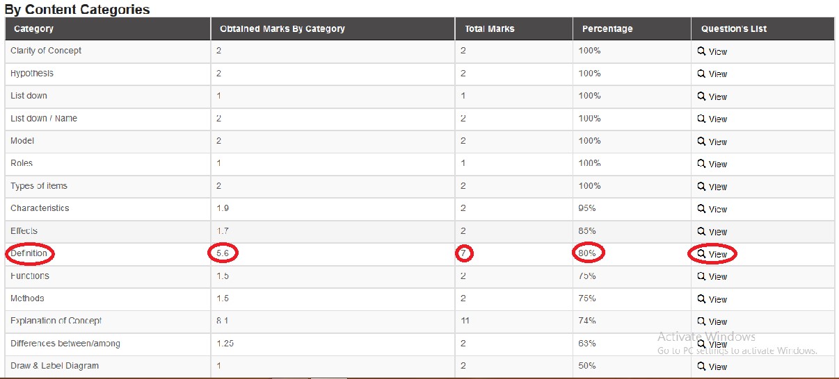 EBEEPS has divided all the books of each class in to various content categories based on questions being asked by various boards in the papers, like definitions, roles, factors, laws, functions, methods, model, types of various items and so on. Every question being asked by the examiners in any board exam revolves around these content categories. We also provide analytics based on these content categories to help students to monitor and gauge their exam preparation performance. In the analytics, initially the summary of percentage marks obtained in all content categories is provided linking each category with the original questions asked; the strongest and the weakest areas of performance in these content categories are also given along with the list of questions form whole book or the specific chapter (based on criteria provided above for search of analytics). These analytics, as a matter of fact provide the list of questions in which students need special focus being the grey area of their preparations.