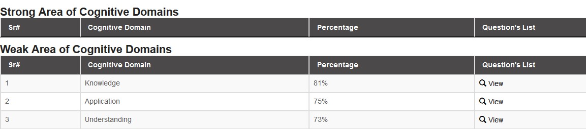 With a view to pin point the grey areas of students’ preparation progress, EBEEPS also highlight the areas with respect to Cognitive Domains in which students progress is up to the mark while showing the weak spots of their preparations, so that they can lay their maximum focus in these areas. Below is the screen shot from the analytics reports of a student who’s all the results in all three cognitive domains fall in weak area. However, further below the detail report will indicate only those questions in these domains in which the student is weak, thereby pin.